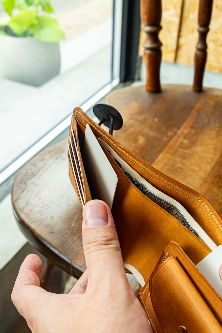 二つ折りのコンパクトなサイズ(110mm x 95mm)でありながら、日々の使い勝手にも徹底的にこだわりました。カードポケット3段とそれぞれの背面に配されたエクストラポケット、ゆとりのある札入れ、広めのマチでスムーズなコインポケットを備え、スマートな収納力を実現しています。
