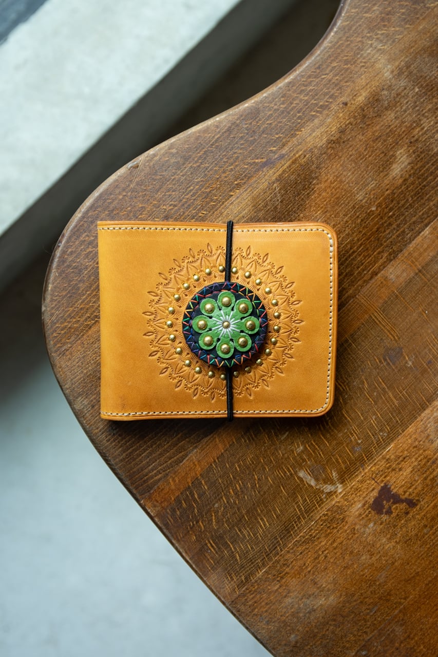 真鍮のスタッズと彩り豊かな装飾が醸し出すエキゾチックな雰囲気。そして、ユニークなゴムバンドの開閉部が、この財布の独自性を決定づけます。