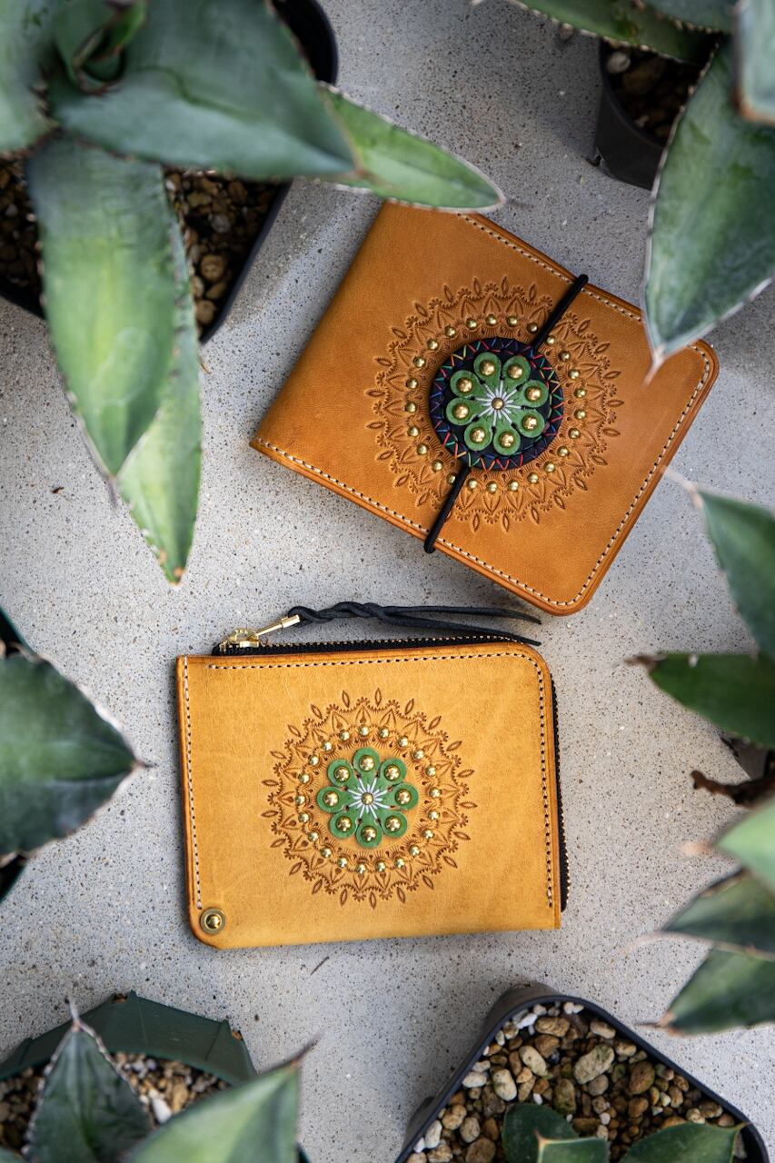デザインの核となるのは、ブランドオリジナルの花や太陽をモチーフにしたスタンピング。一つ一つ手作業で刻印することで、量産品には決して真似のできない、温かみと表情が宿ります。