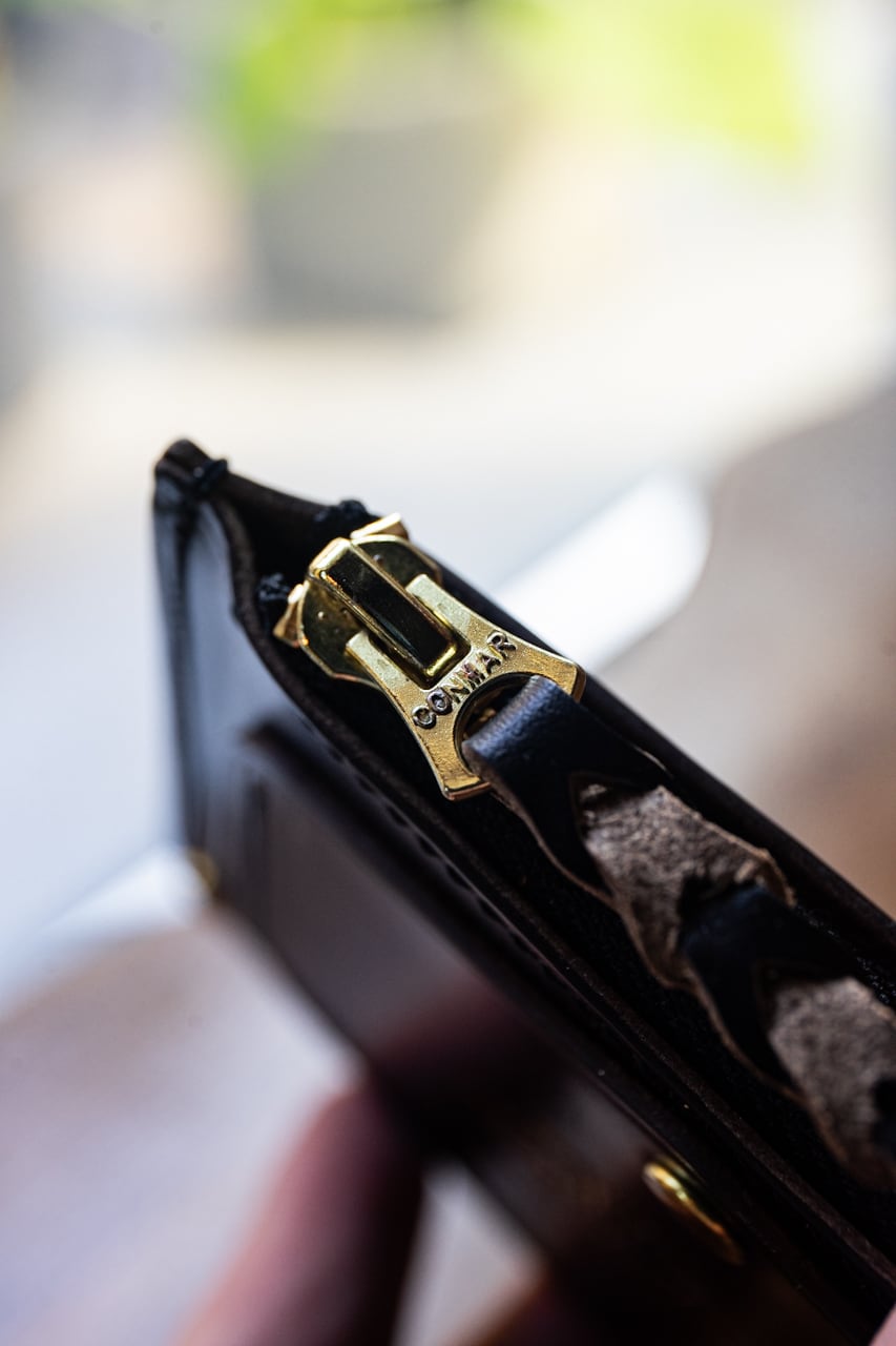 メインファスナーには、ヴィンテージ愛好家を魅了するCONMAR(コンマー)社製ジッパーの復刻モデルを採用。武骨で美しい真鍮製の引き手が、クロムエクセルレザーの重厚さと見事に調和し、開閉時の心地よい操作感を提供します。
