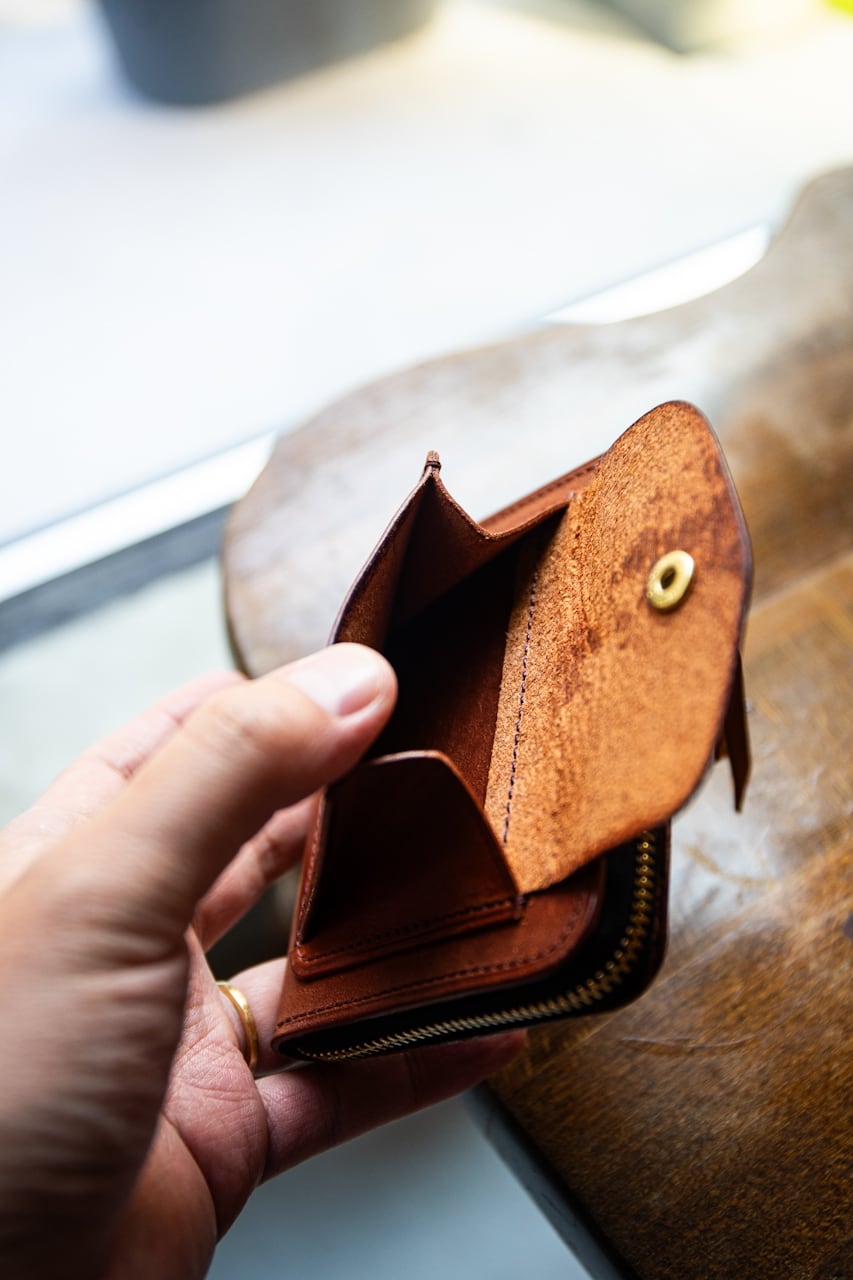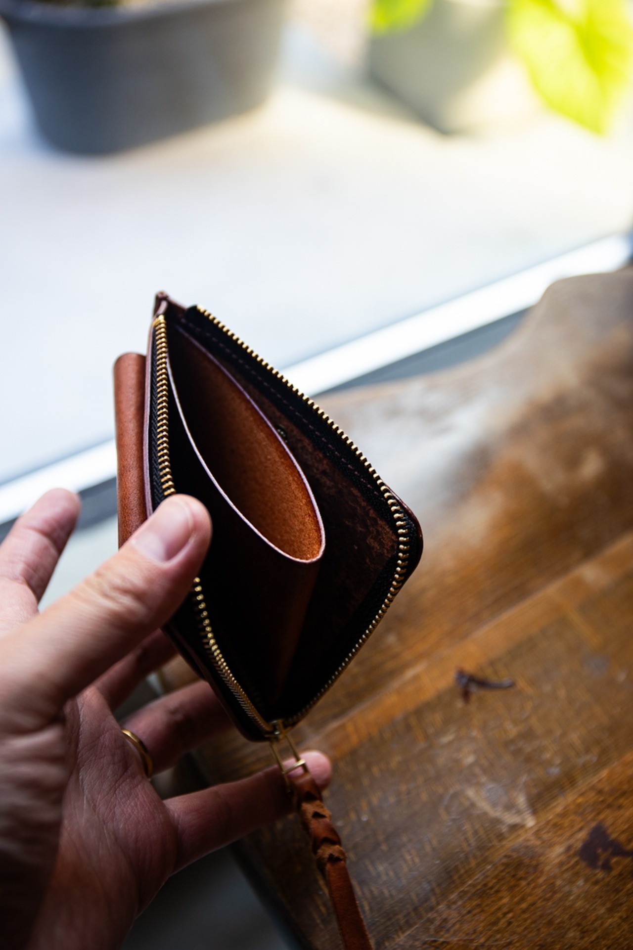 「財布としての機能」にさらにフォーカスを当てた内部設計。L字ファスナーを開くと、二つ折りの紙幣や数枚のカードをスマートに格納。無駄を削ぎ落としつつ、必要なものへのアクセス性を極限まで高めています。