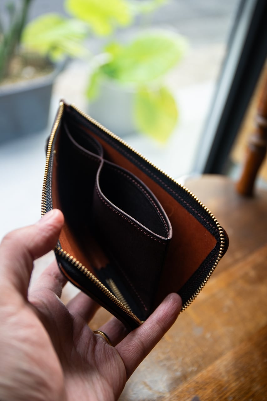 • 機能的な収納: L字ファスナー式で中身全体へのアクセスが容易。紙幣や領収書も折らずに収納でき、十分なカードポケットを備えています。