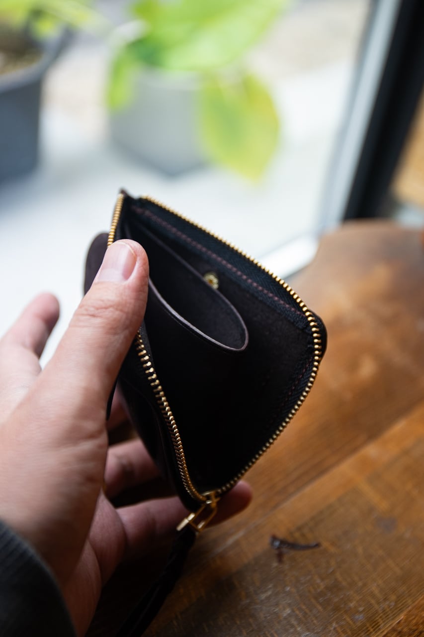 ミニマルな設計: L字ファスナーの内部には、二つ折りの紙幣とカードを収納。究極にシンプルながら、日常使いに十分な機能を凝縮しています。
